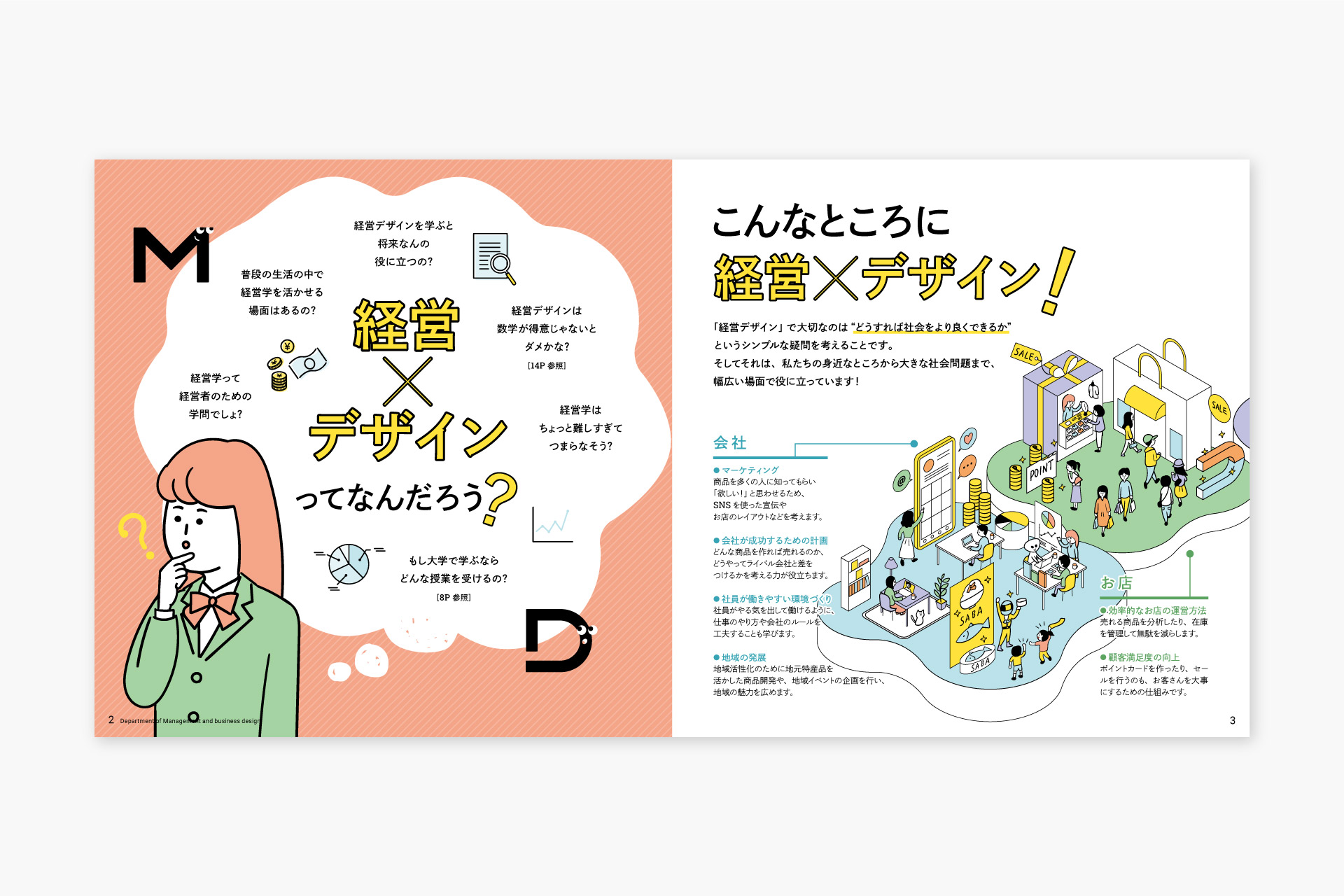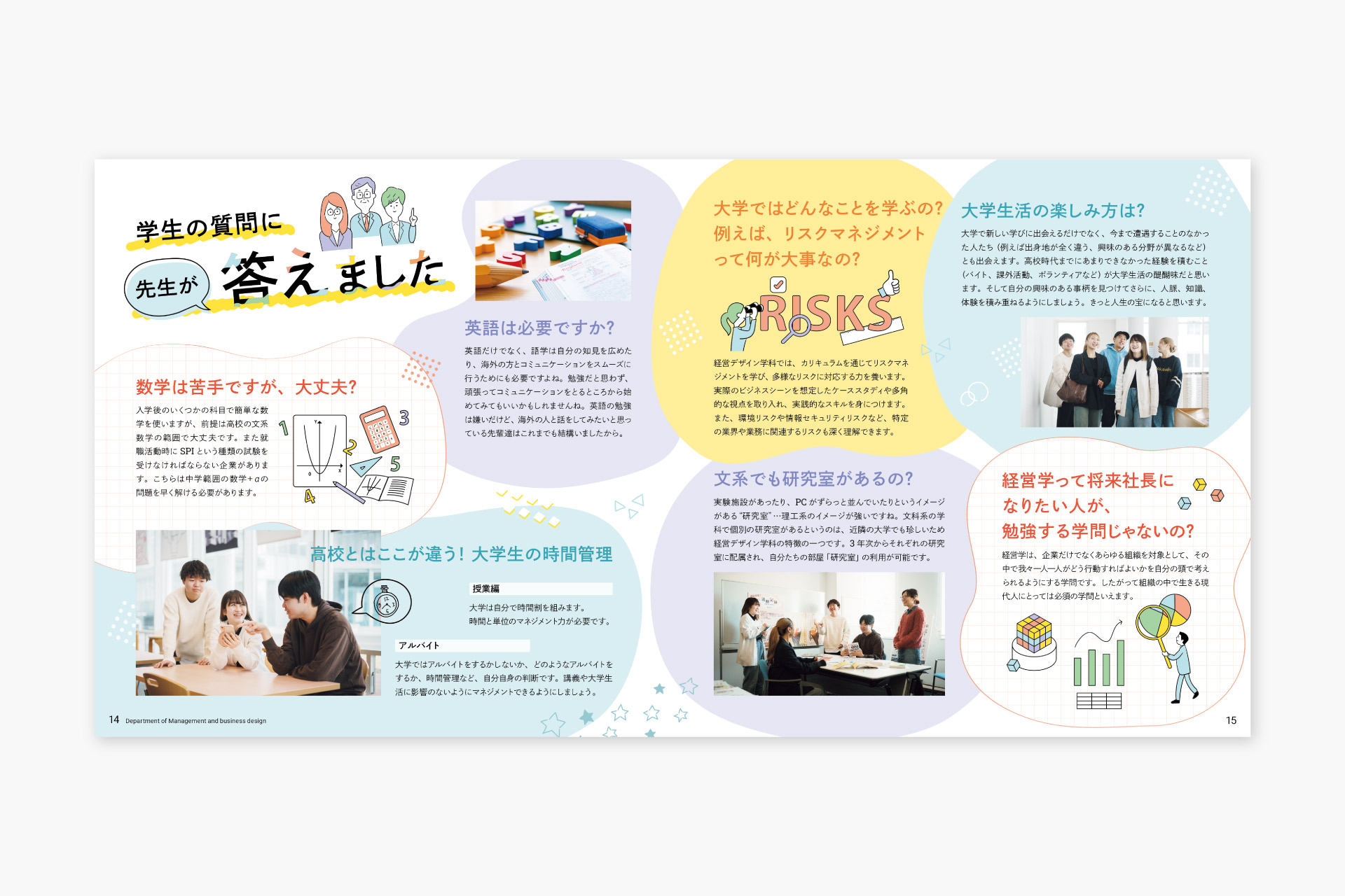 さらに、4年間の学びの流れのフロー図や、高校生から寄せられる質問をQ&A形式で紹介するページなど、コンテンツも“読みやすさ”と“分かりやすさ”を意識しました。